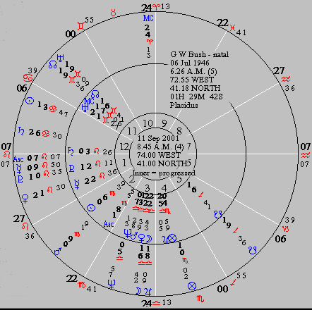 The people of the USA, at this time in our history need to look at certain issues of power. The present leader of the US, George W. Bush, will show through his horoscope lessons that are appropriate to both himself and the nation in general. The Sun in the 12th house, lessons of power expressed to manipulate rather than nurture or share. George's father was head of the CIA an organization of secrets and manipulations from behind the scenes. Cancer, lessons of security (home and homeland). With 27 degrees Aquarius on the 8th house, Aquarius and Pisces share his 8th house. Ruler Saturn in Cancer indicate an underlying insecure fear of lack. Uranus, co-ruler of Aquarius is his 1st planet in elevation and in zodiacal position. Uranus is sextile to Venus of charm and attraction, and trine to the last planet zodically in his chart, Jupiter placed in the 3rd house and co-ruler of Pisces and his 8th house. Genius in communication (Gemini 3rd sign), and inheritor of knowledge due to a planet connected with the 8th house, Jupiter, placed in the 3rd house. To top it off, Mercury is conjunct Pluto in the 1st house, sign Leo. The power of communication, use of knowledge, and protection with charm will be George W. Bush's obvious assets.